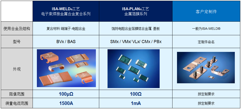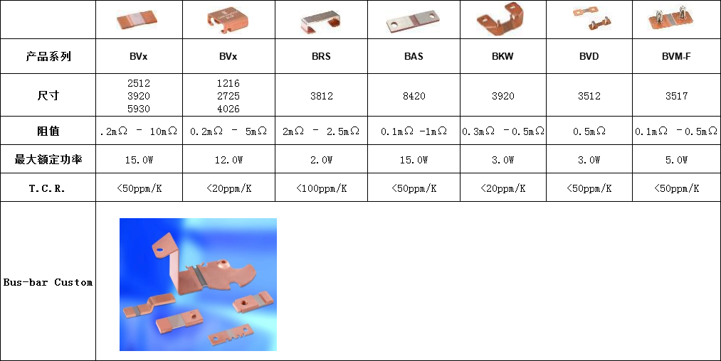 产品特性:低温度系数TCR(<20ppm/K)、高稳定性、超低的热内阻、低热差电动势(对于铜),低阻值低功耗,高机械强度,产品阻区间在100uΩ—100Ω,电流测量范围1mA-1500A。